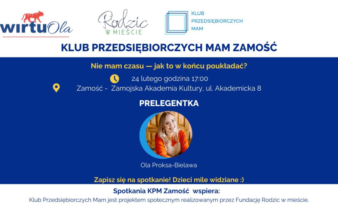 On February 24, 2026 at 5:00 PM, the Zamość Academy of Culture (ul. Akademicka 8, Zamość) will host another meeting of the Entrepreneurial Moms Club. This event will focus on the topic of time management, especially in the context of parenthood and balancing multiple responsibilities.