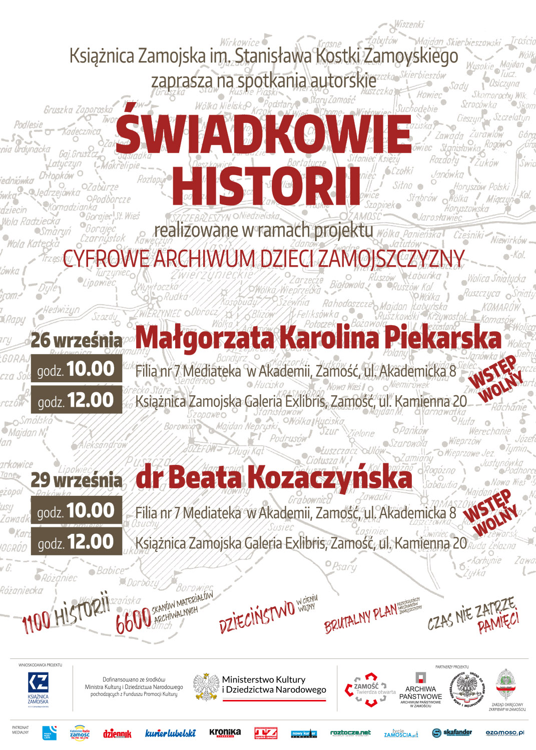 Książnica Zamojska im. Stanisława Kostki Zamoyskiego zaprasza na spotkania w ramach projektu „Cyfrowe Archiwum Dzieci Zamojszczyzny”. 26 września – Małgorzata Karolina Piekarska („Syn dwóch matek”) 2 9 września – Beata Kozaczyńska („Ocalone z transportów Dzieci Zamojszczyzny”) Godz. 10.00 – Zamojska Akademia Kultury (Filia nr 7 Książnicy Zamojskiej)